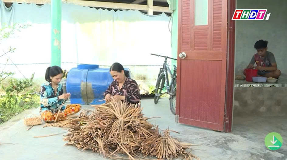 Như Ngọc cùng mẹ làm thêm công việc đan lục bình tại nhà để kiếm tiền trang trải học phí.